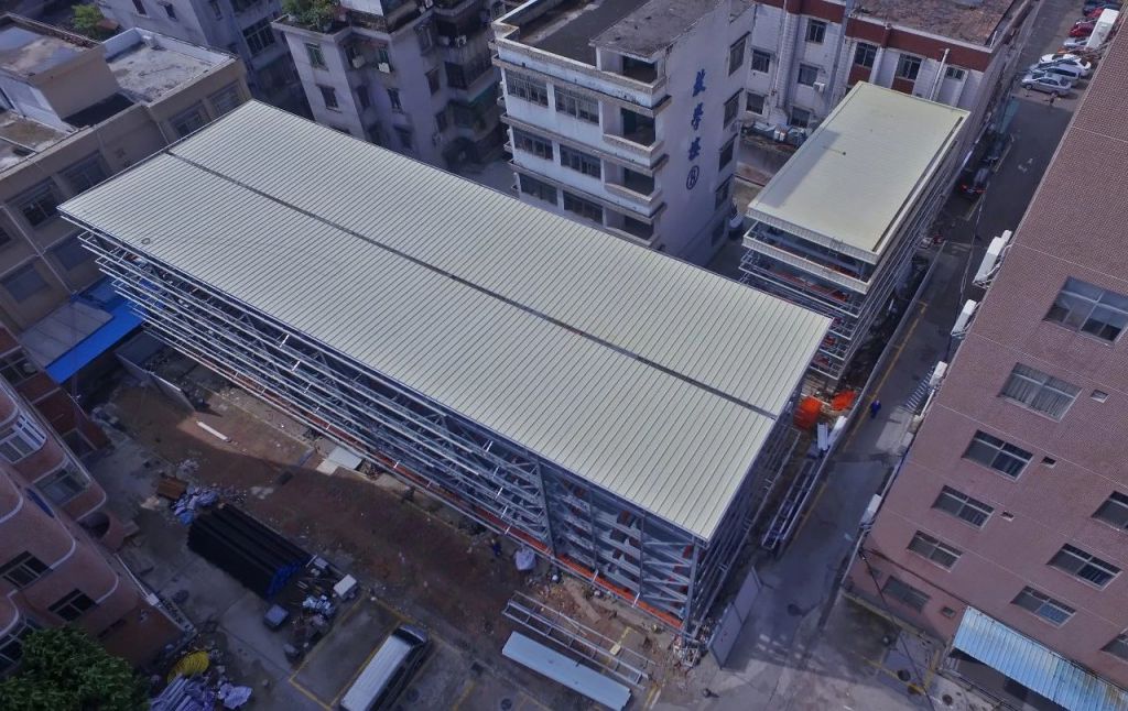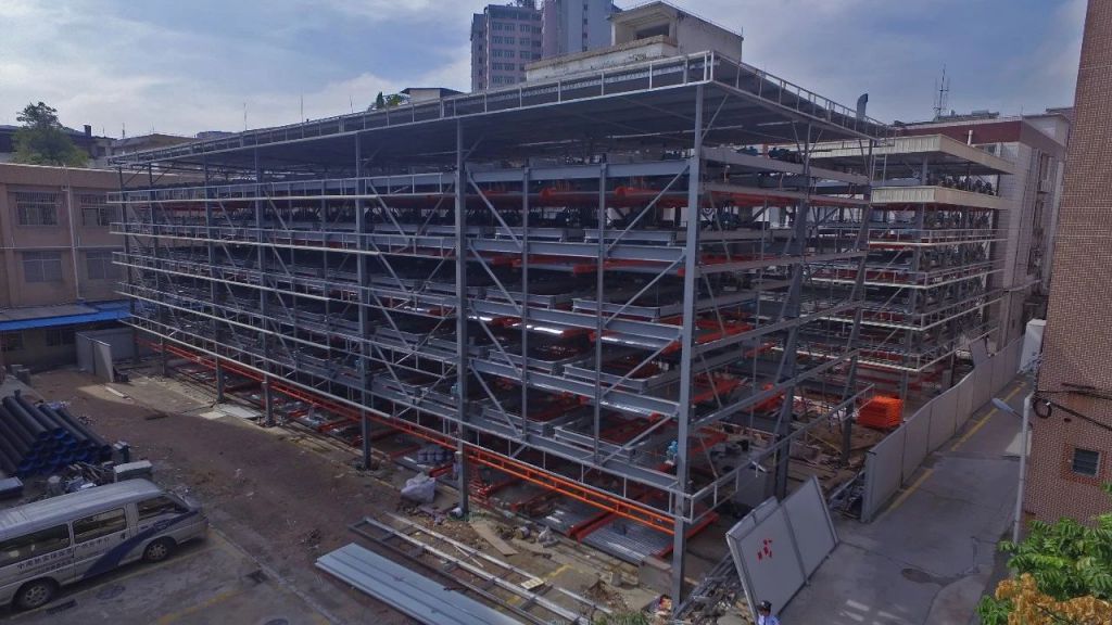 立体车库从2016年7月25日起开始施工,历经基础施工和放样、主框架安装、横移轨道安装、顶层框架安装、横移框架安装、传动系统安装、载车板安装、安全防坠系统安装、电控系统安装、消防和排水以及通风照明设备安装、调试等施工程序,于2017年1月4日顺利通过验收,正式投入使用。