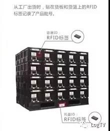 从工厂出库时,贴在货板和货篮上的RFID标签记录了产品批号