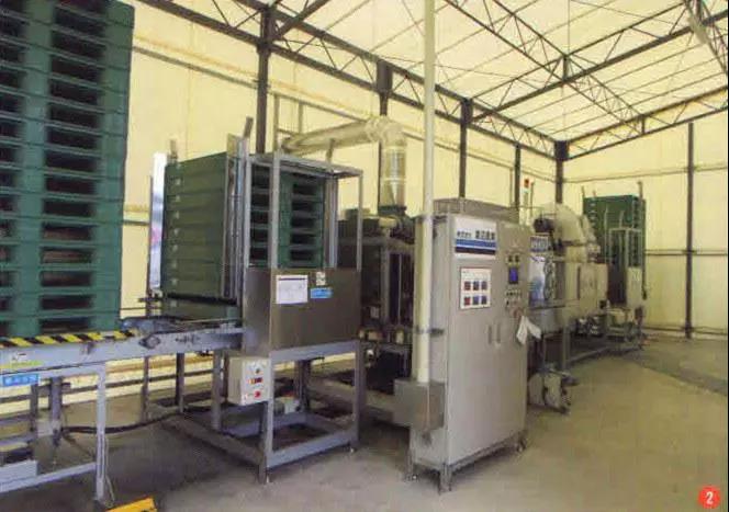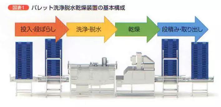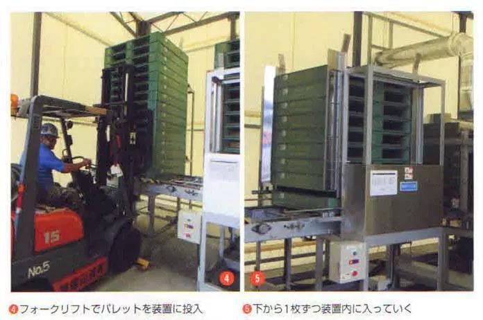 首先,用叉车将使用过的托盘放在装置上,然后用传送带运至旁边的自动分层机,之后由下往下一个个将托盘放入清洗脱水装置。
