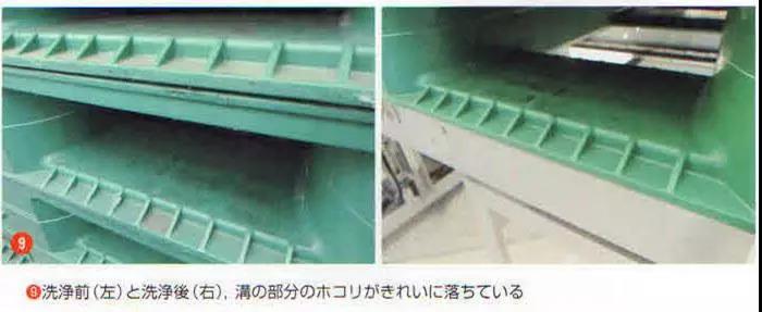 清洗的时候使用约 60℃的温水,装置内部有清洗喷管,通过喷射温水洗掉托盘上的污垢。这样可以洗掉托盘各个角落的污垢,也不会出现人工操作的高压清洗机那样的内部污垢残留的问题。