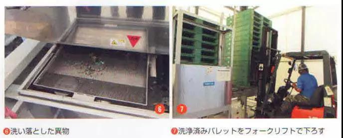 注:洗落的杂物;用叉车将清洗后的托盘卸下。