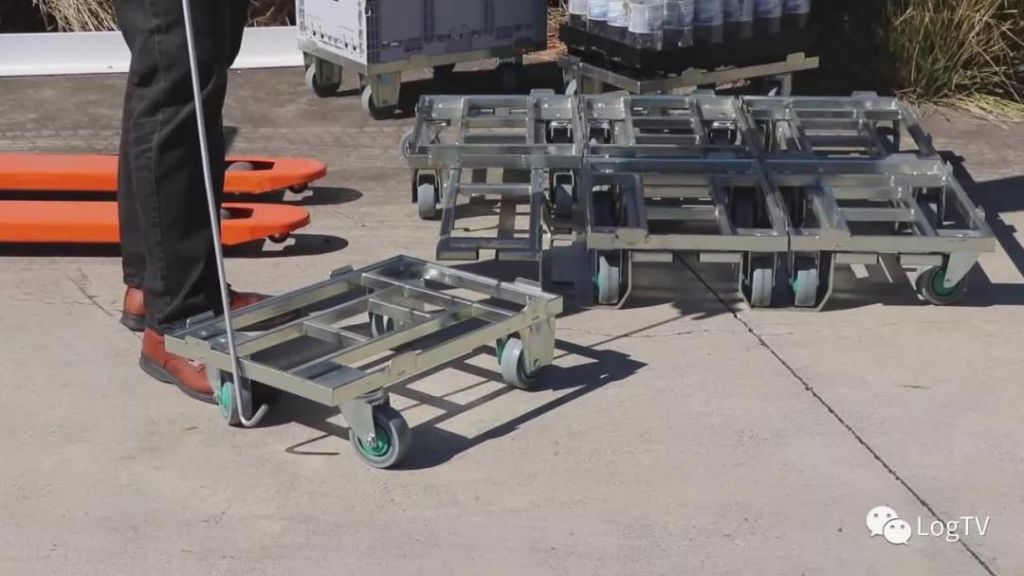 拆分出来的独立小托盘能够当作“小拖车”使用。工人只要将货物堆砌在托盘上,配个小铁钩或是绳子就能拖着货物走。虽然它不像大的手动搬运车那样有机架和手柄,但它有堆货区和滚轮,就能移动货物。